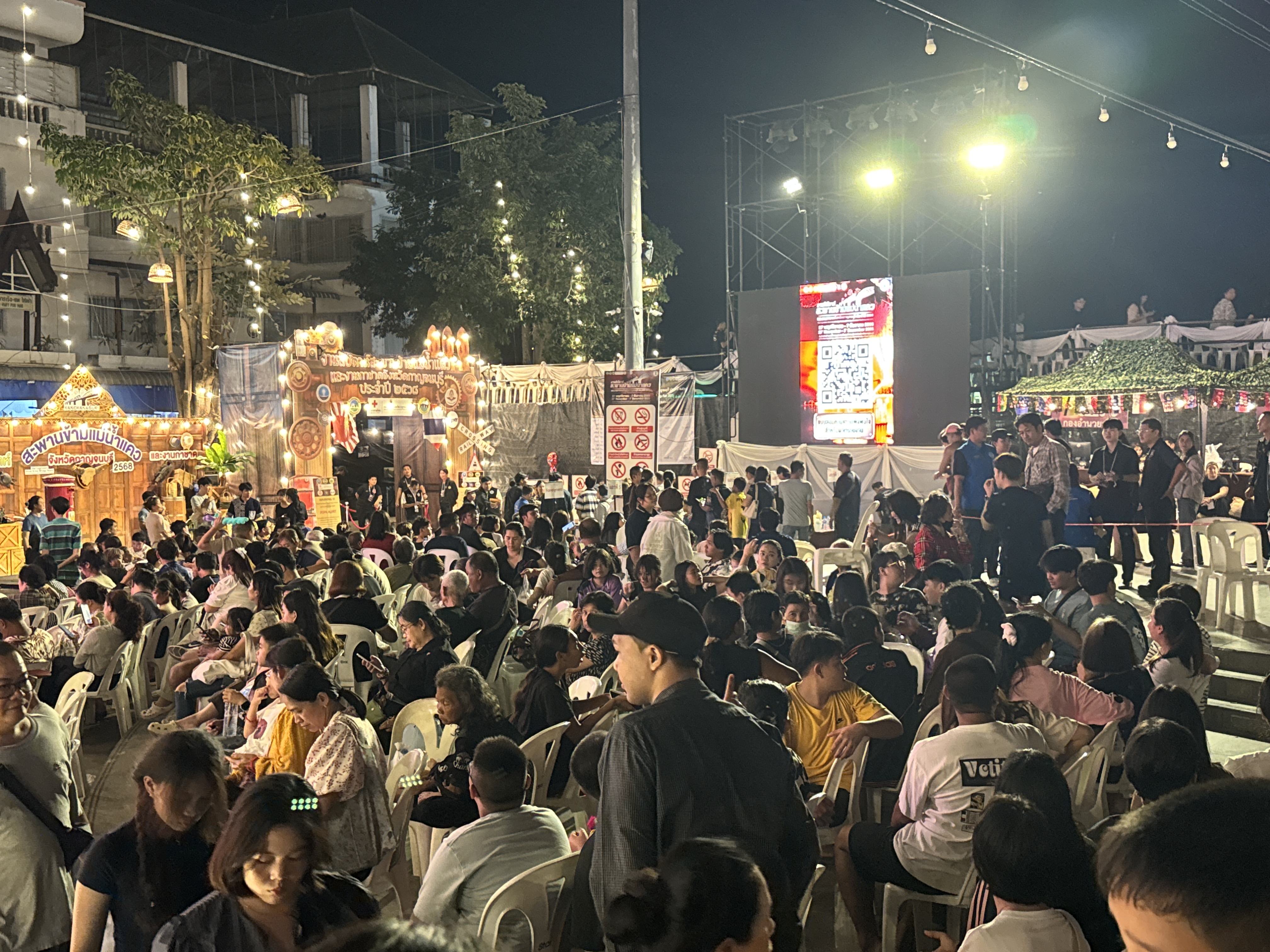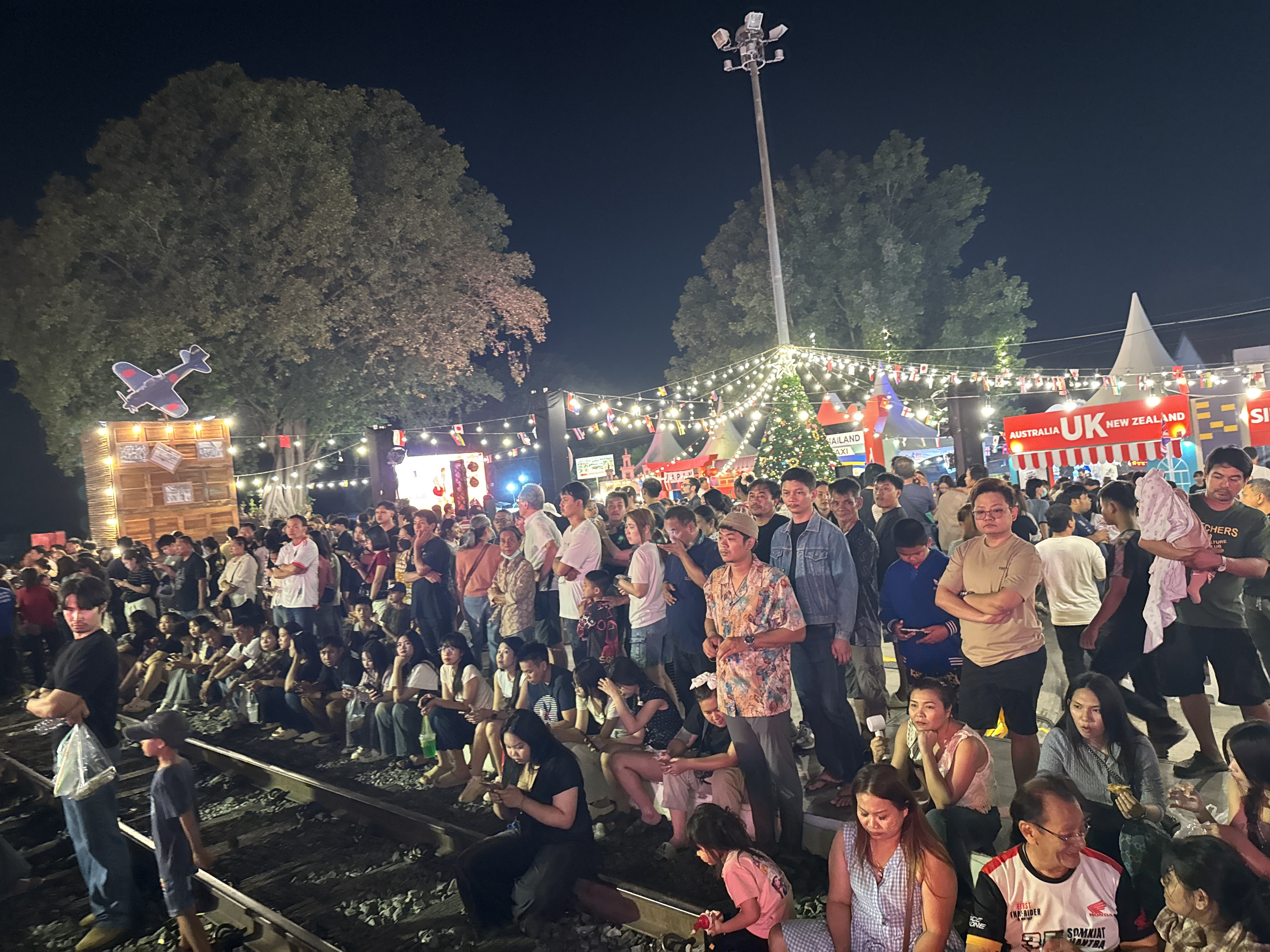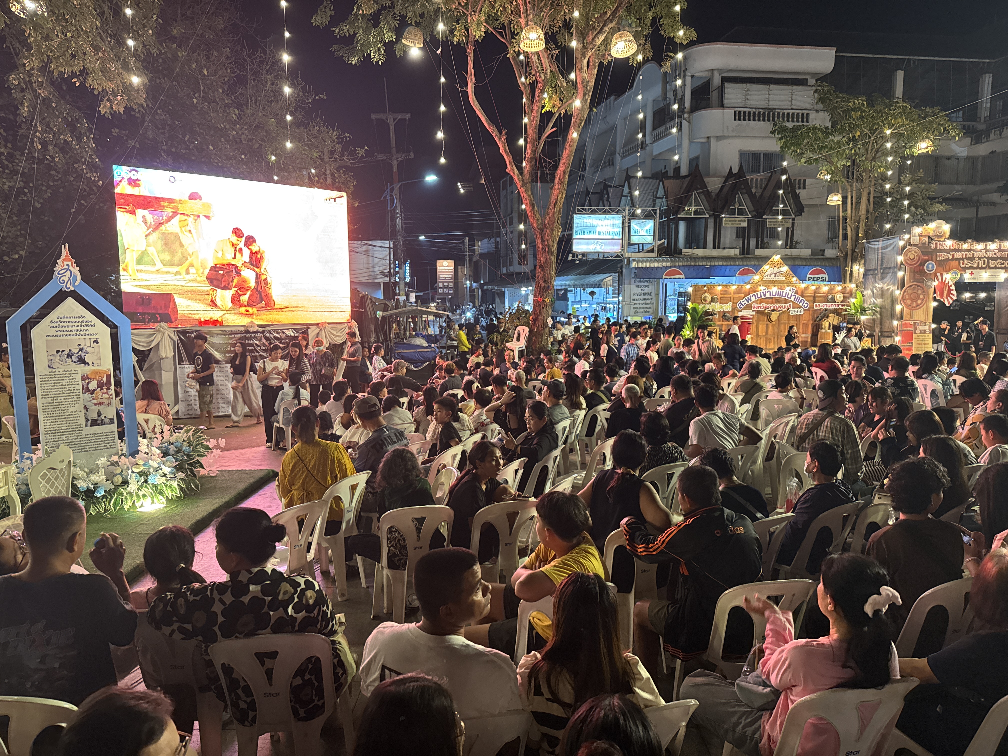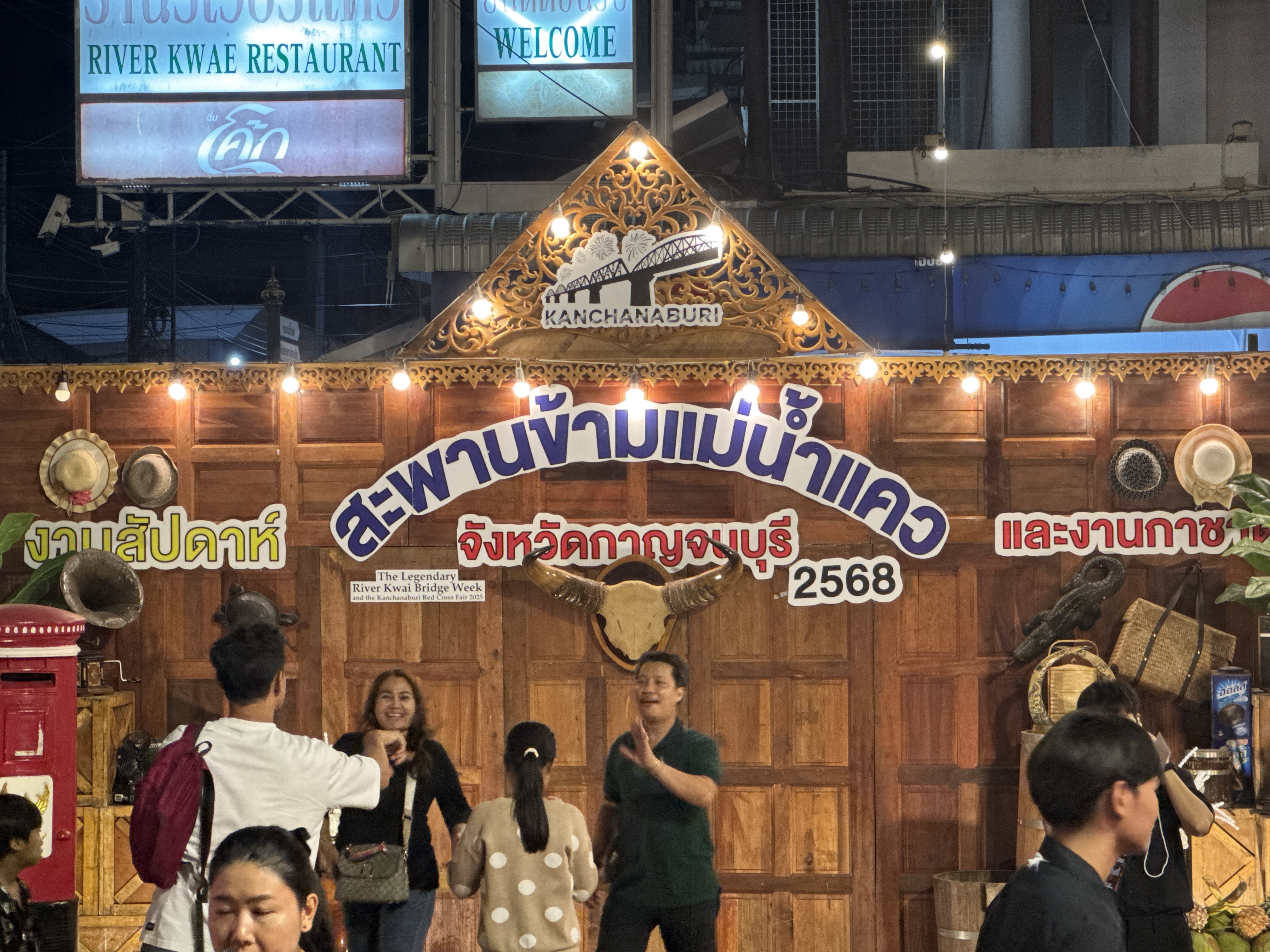 The atmosphere remains relaxed and overwhelmingly local, with string lights stretching above the walkway, live Thai acoustic music drifting from small stages, and families settling in for the evening. The cool river breeze and views of the illuminated Kwai, often with the distant glow of the River Kwai Bridge, create a calm backdrop. Vendors offer a full range of inexpensive Thai street food, iced drinks, clothing,...