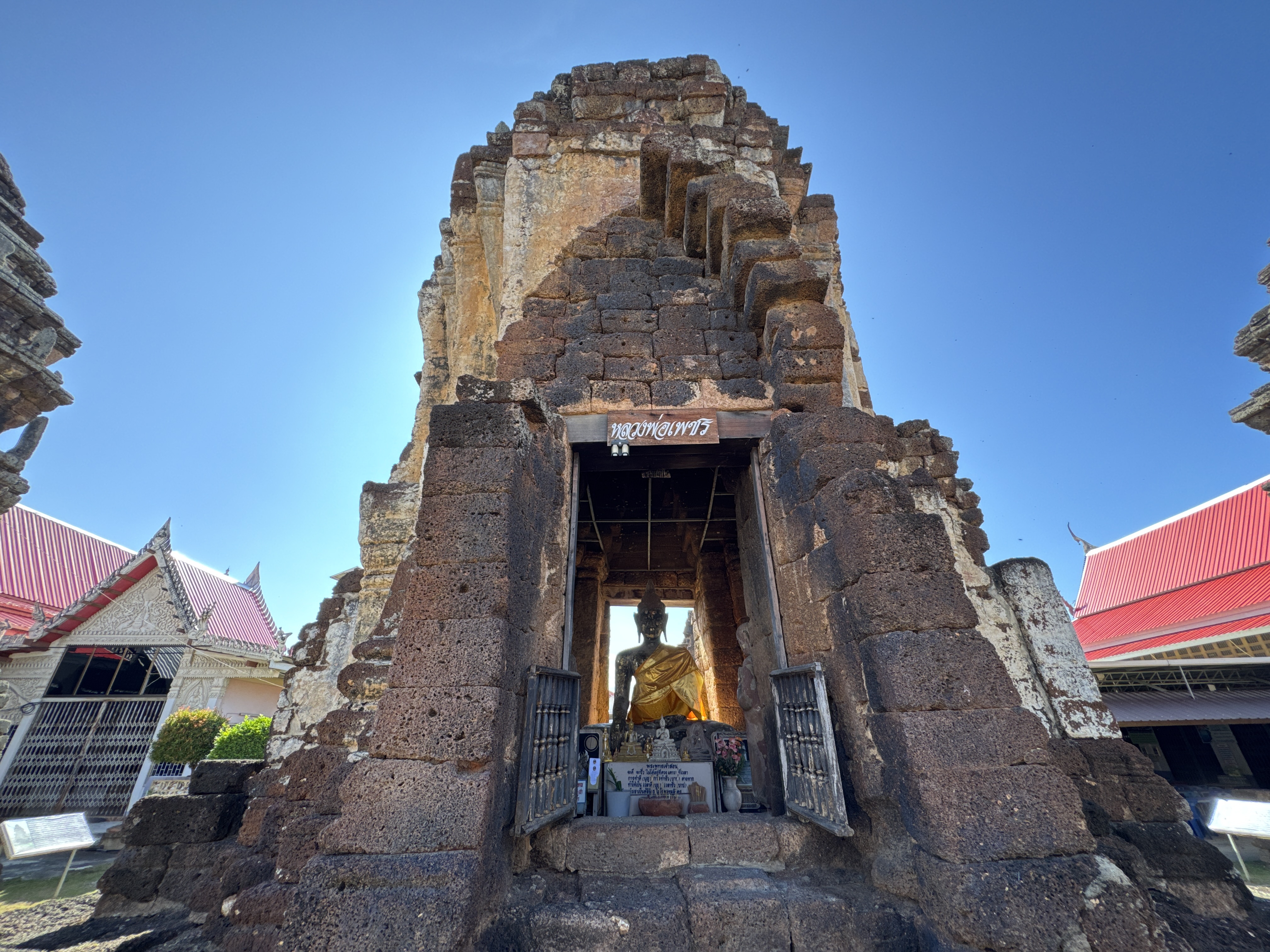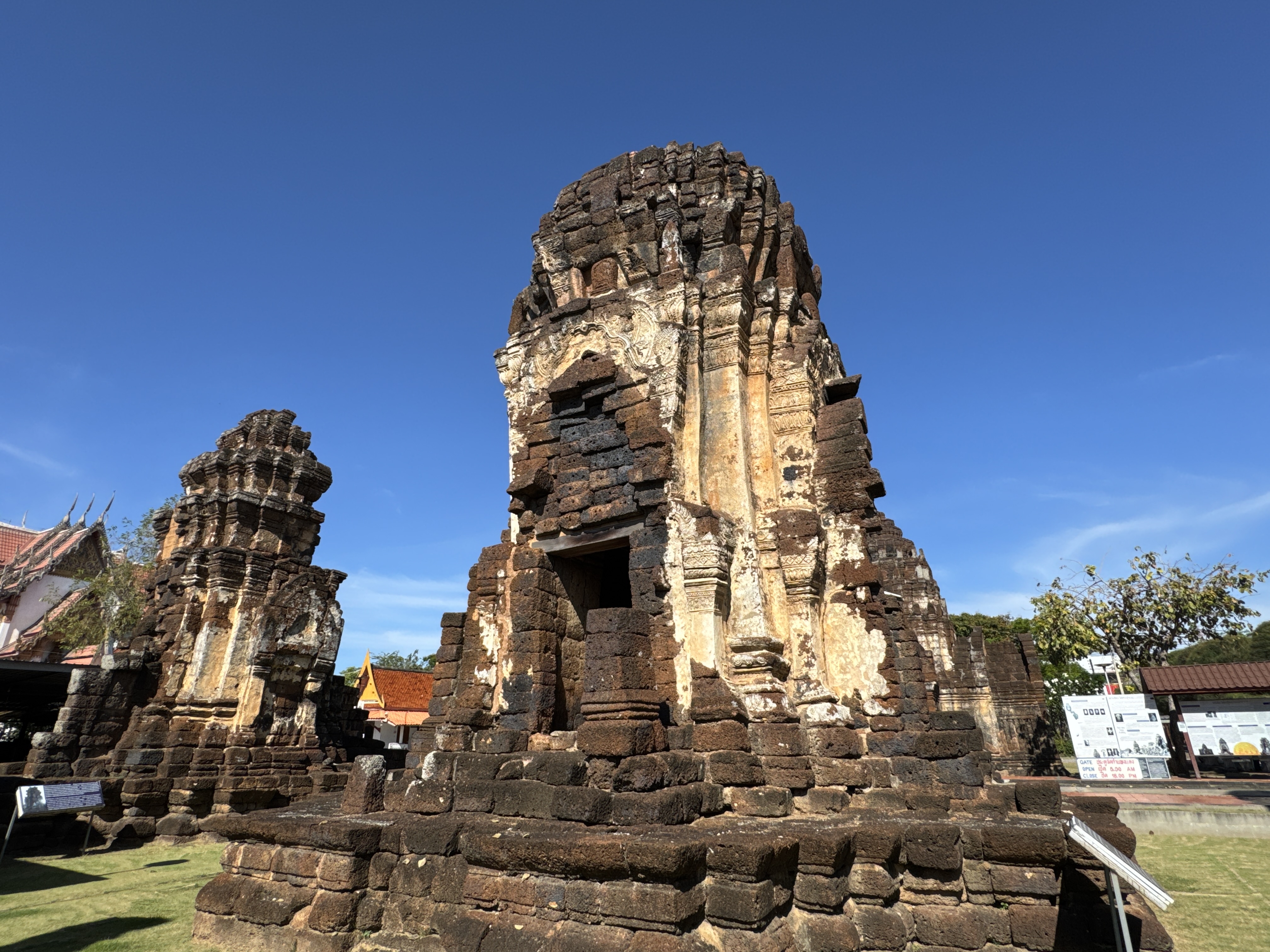 It has a central 35 meter high (115 ft) prang พระปรางด์ประธาน with four smaller prangs. The whole construction stands on a rectangular platform. About halfway up there are hidden entrances, to which steep stairs lead.