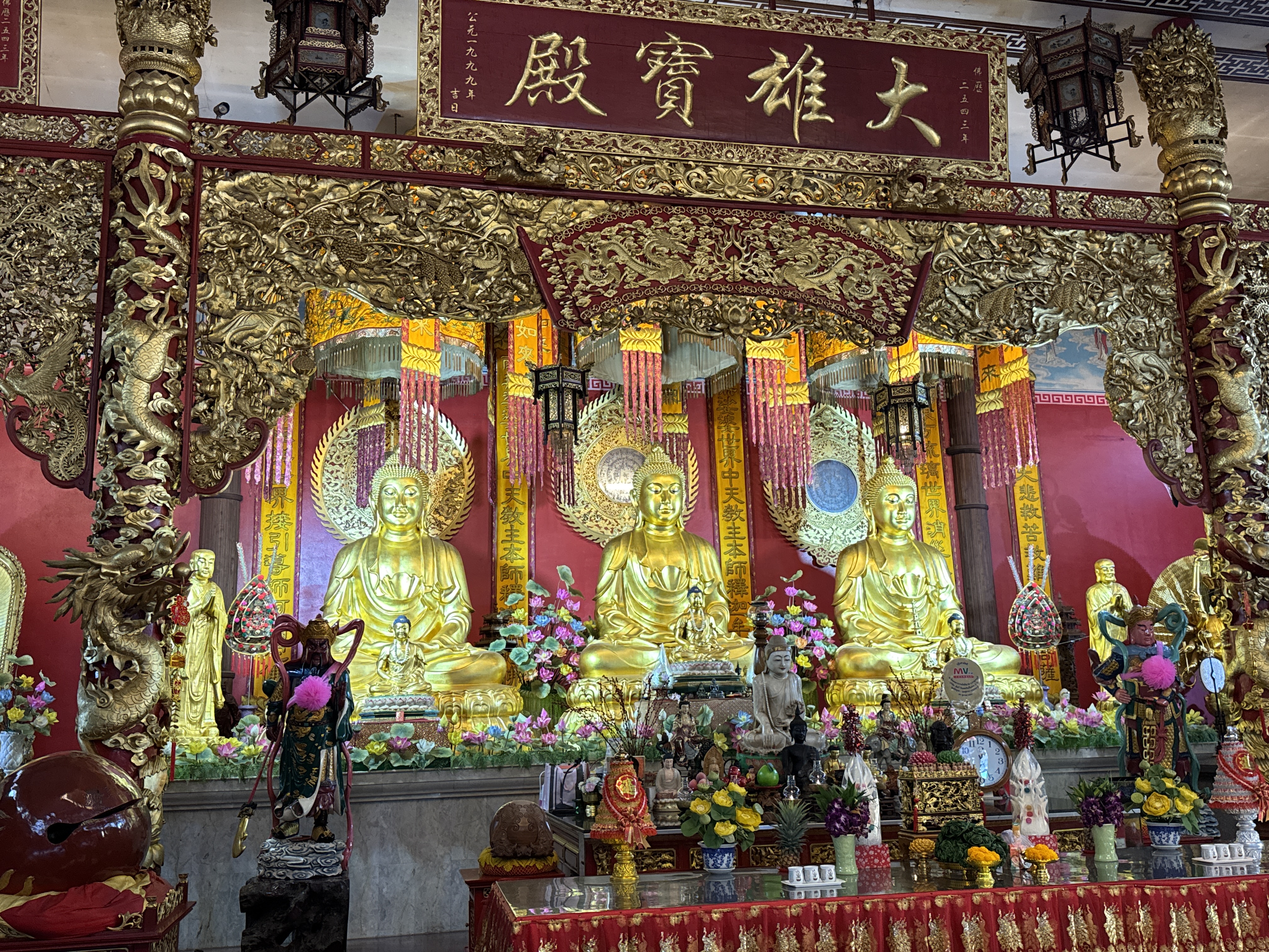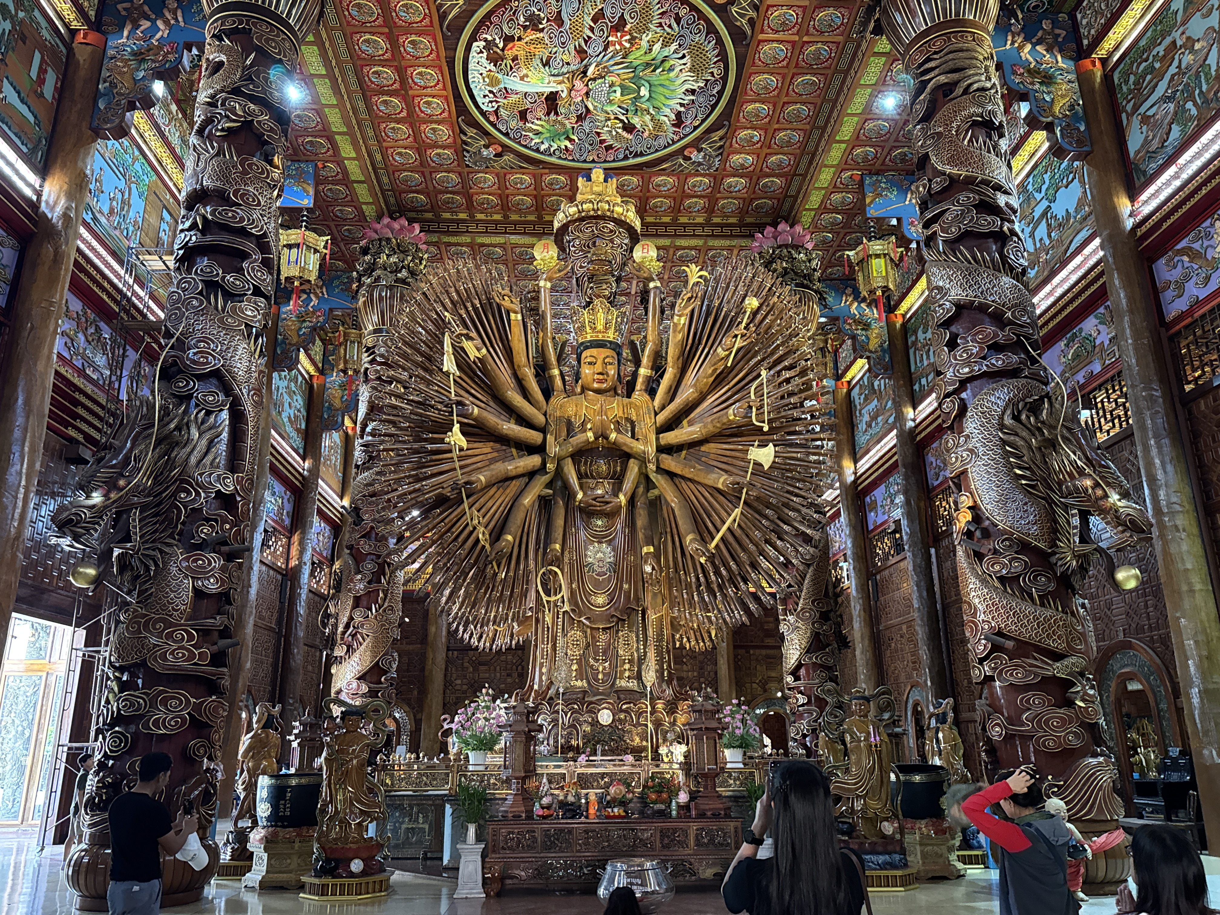 The covered courtyard which welcomes you does not suggest what you are going to discover inside: a hall with all the partitions and ceilings in carved teak wood. In the middle of which enthroned, back to back, are the 4 statues of the chinse goddess with 18 arms and a thousand smaller arms with a thousand eyes.