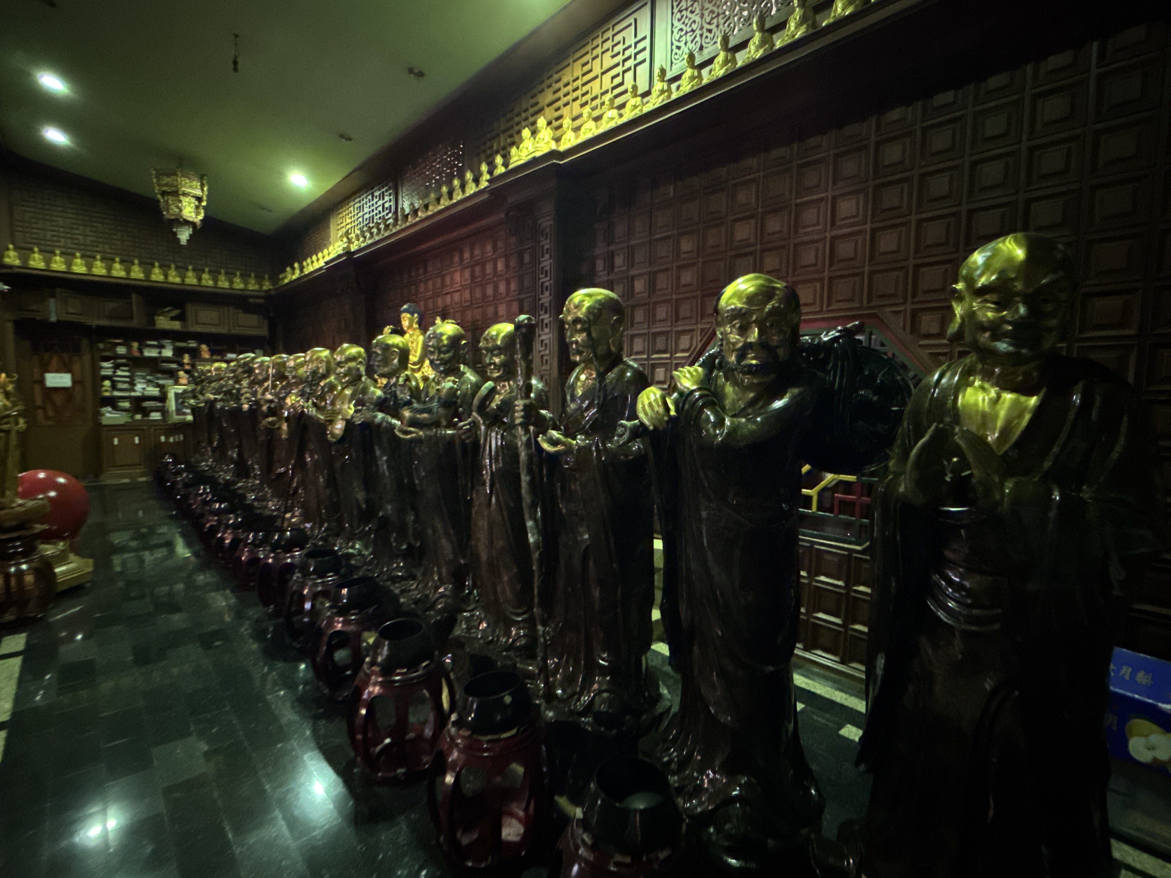 In the peripheral corridors, dozens of unique statues are also made of carved wood. Wat Mettatham Photiyan is set to expand to accommodate even more statues. Hundreds more are already stored to the right of the main hall and are waiting to be installed in the new temple buildings.
