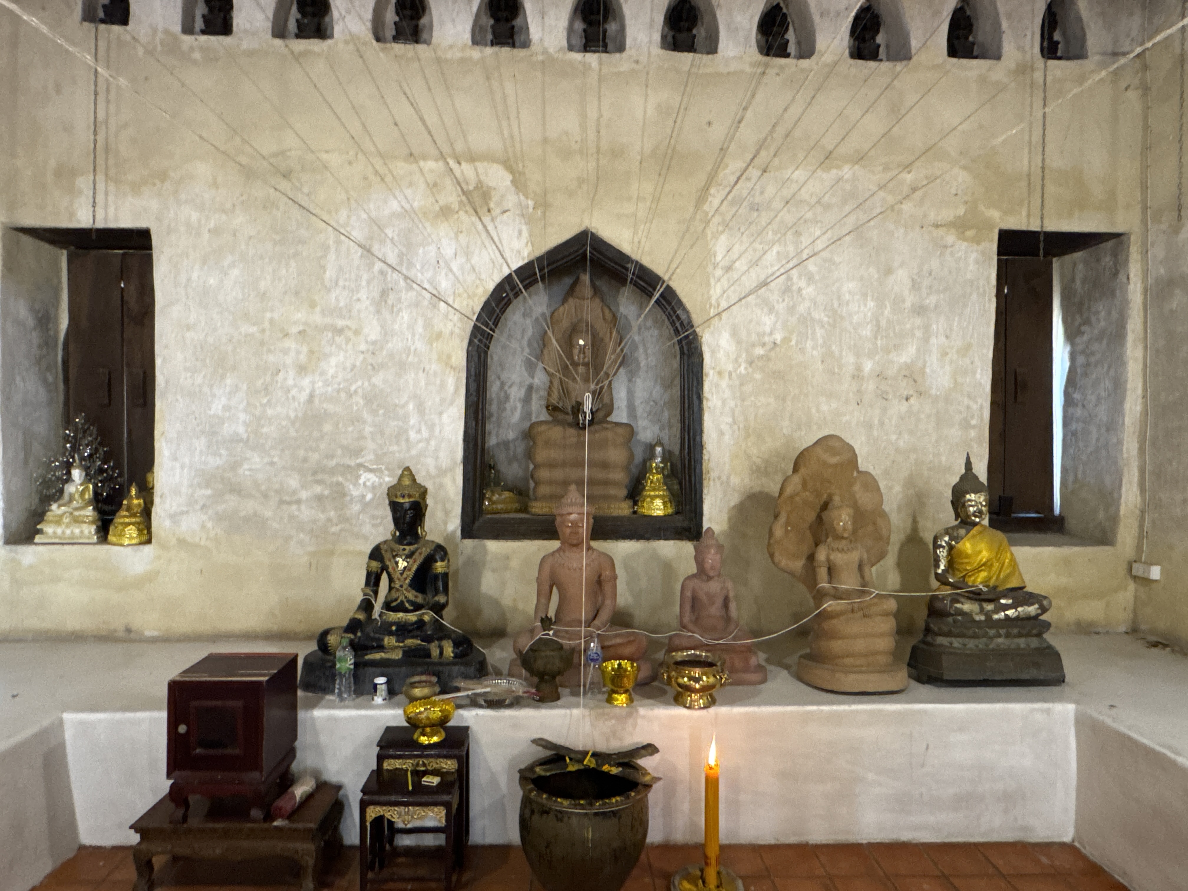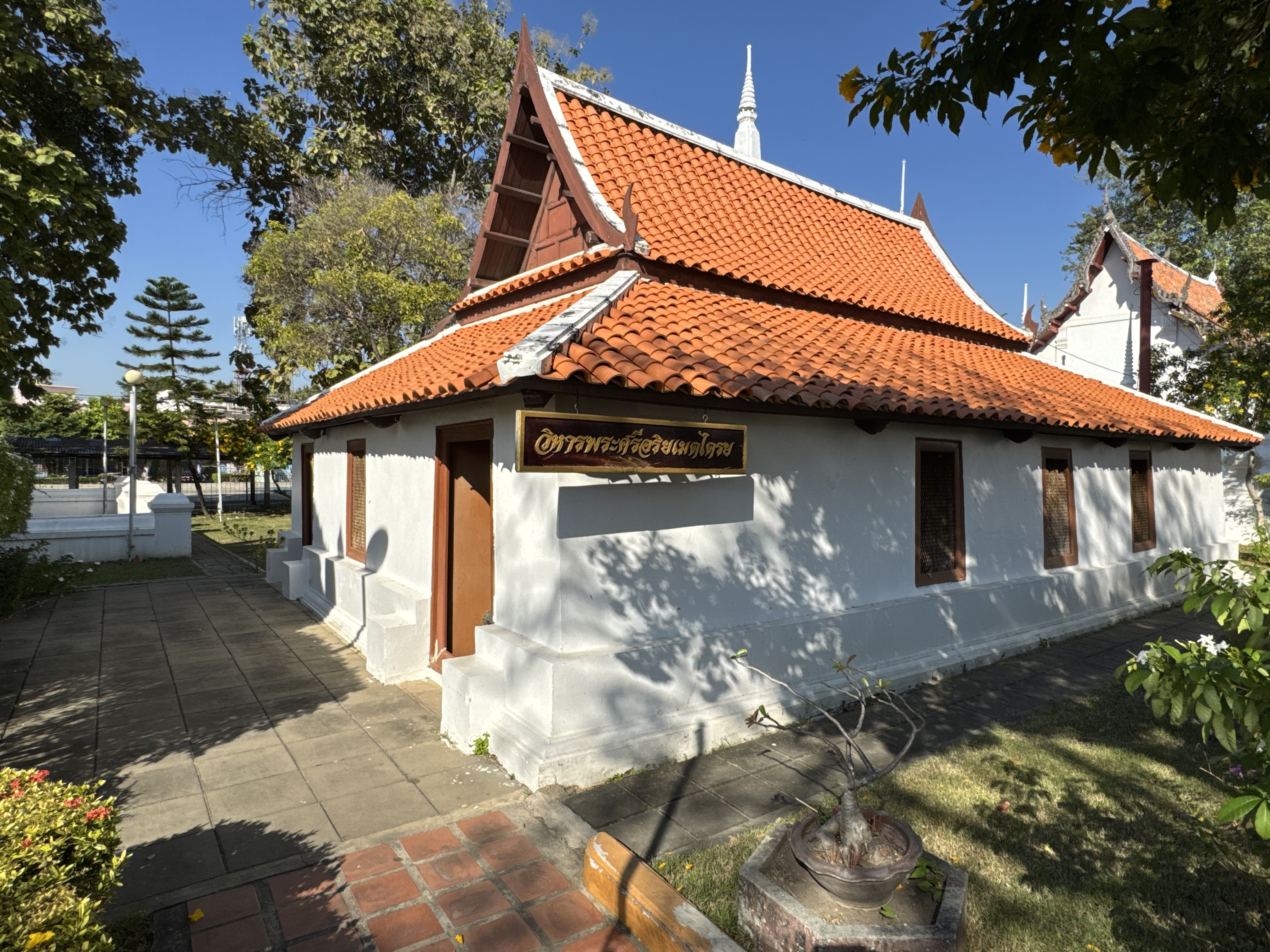 The base of the wihan is a lotus flower shaped pedestal for the Buddhist image where the statue of the Buddha is meditating in Khmer-Lopburi style. The stone boundary markers, the sermon hall has a curved base, lancet windows and curve roofing tiles. These are all architectural styles used during the reign of King Narai.