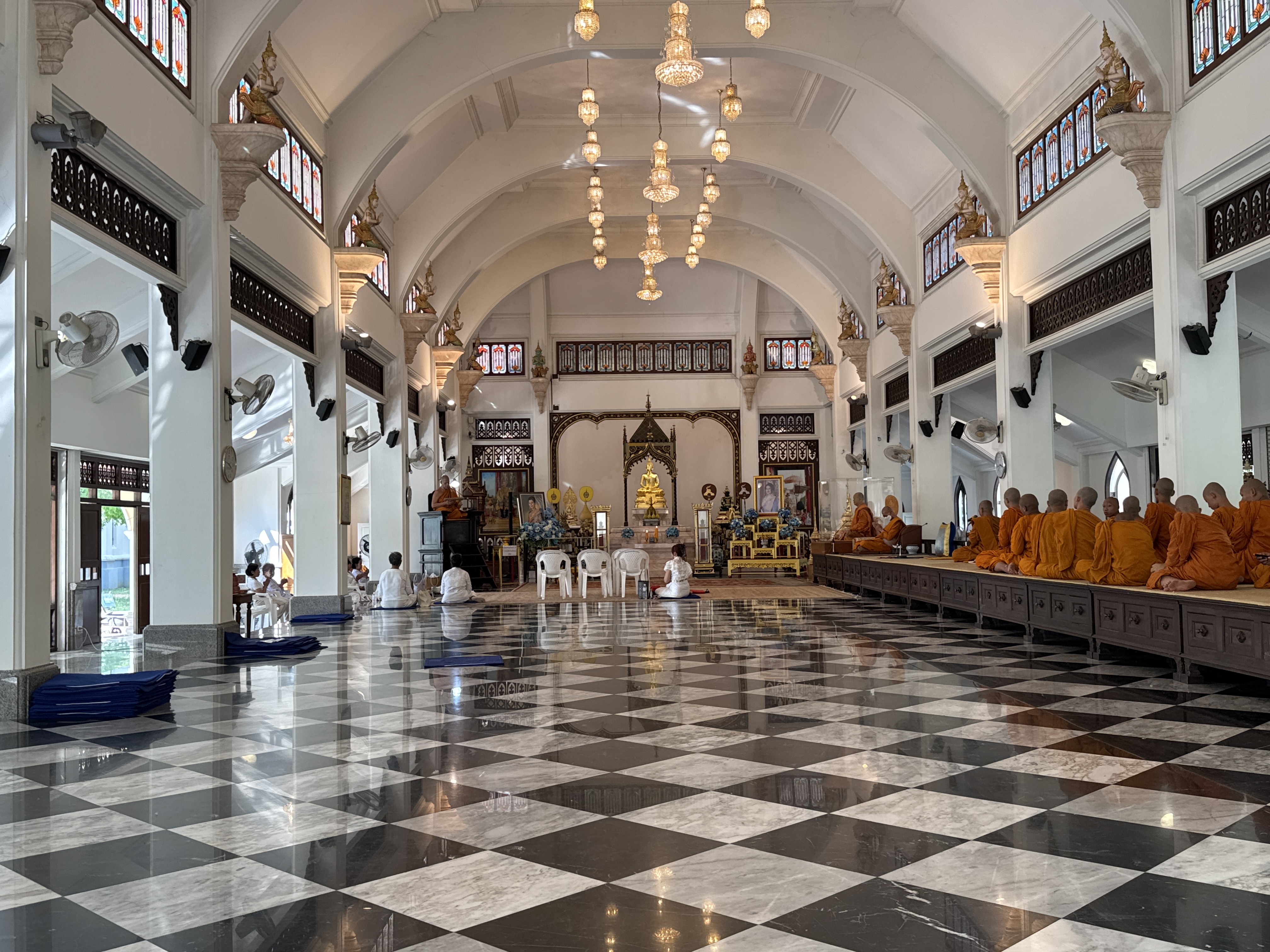 The construction of Wat Niwet Thammaprawat was commissioned by King Chulalongkorn (Rama V) in 1876, to serve as the royal temple for the newly expanded Bang Pa-In Palace. The temple was designed by Joachim Grassi, one of the first Italian architects employed under the king's government. Many public buildings were built in the Western style during Chulalongkorn's reign, a trend reflecting the modernisation of Siam (as Thailand was then known) at the time. Wat Niwet Thammaprawat was built in Gothic Revival style, with stained glass windows and a Gothic ...