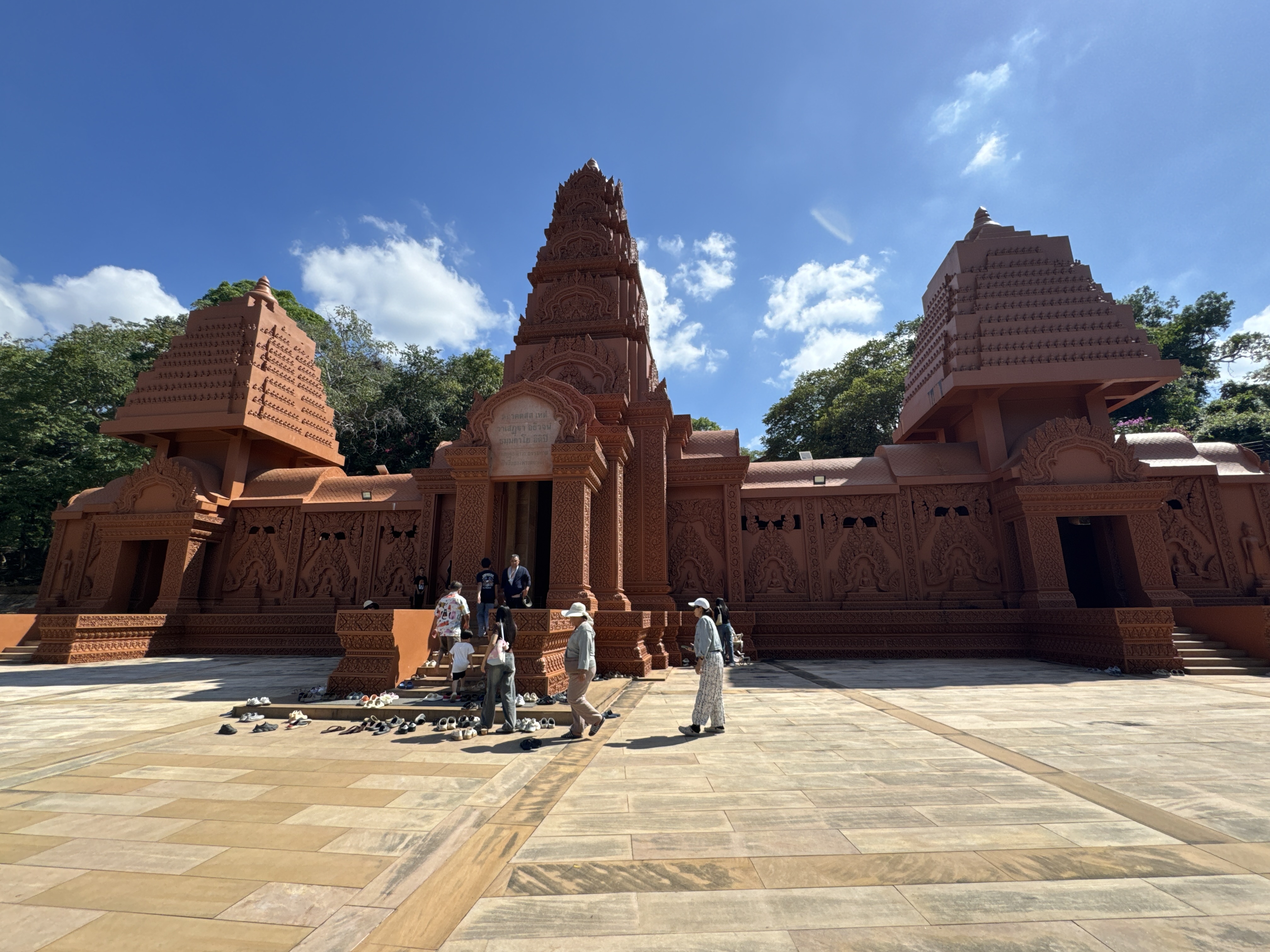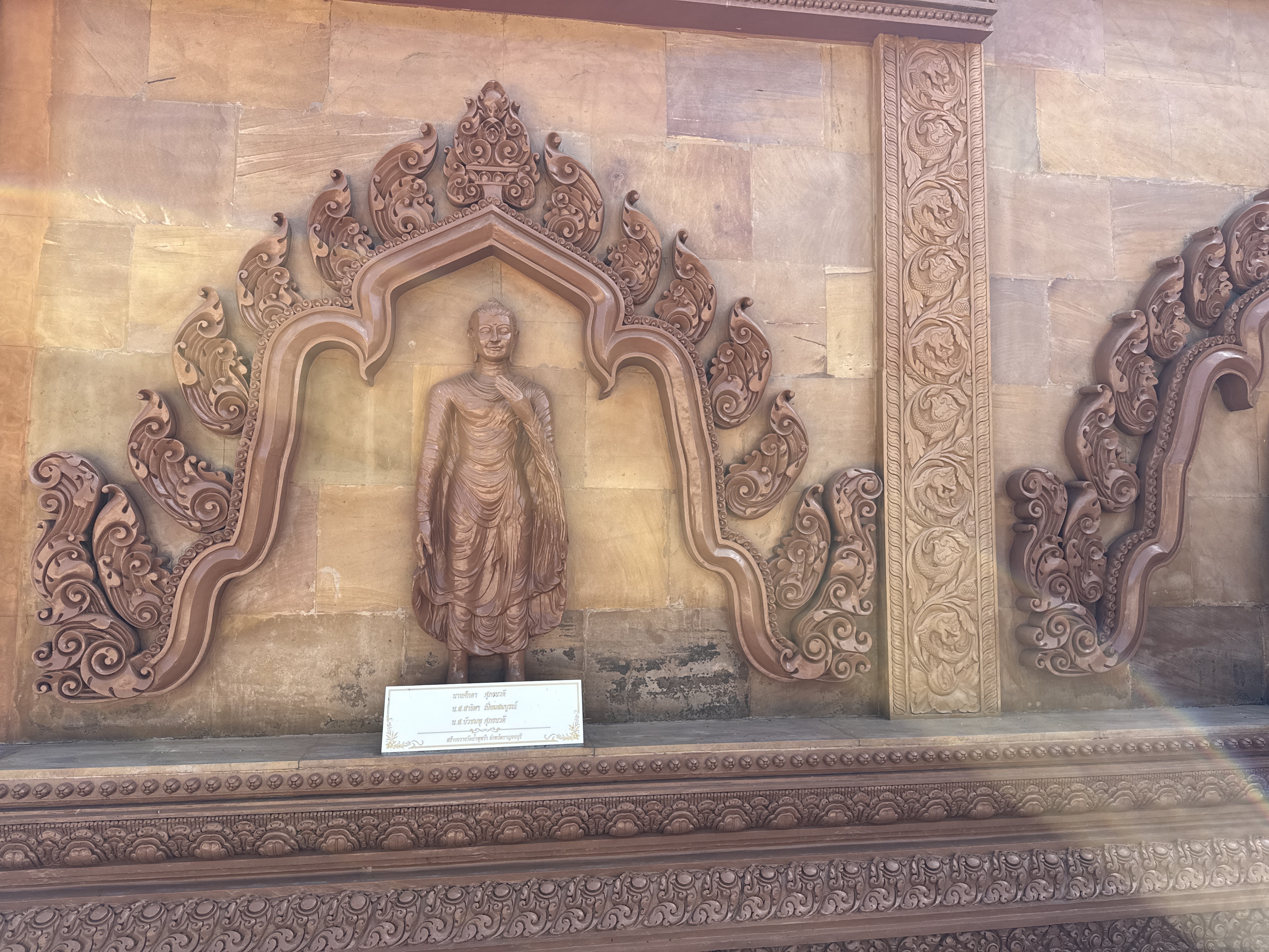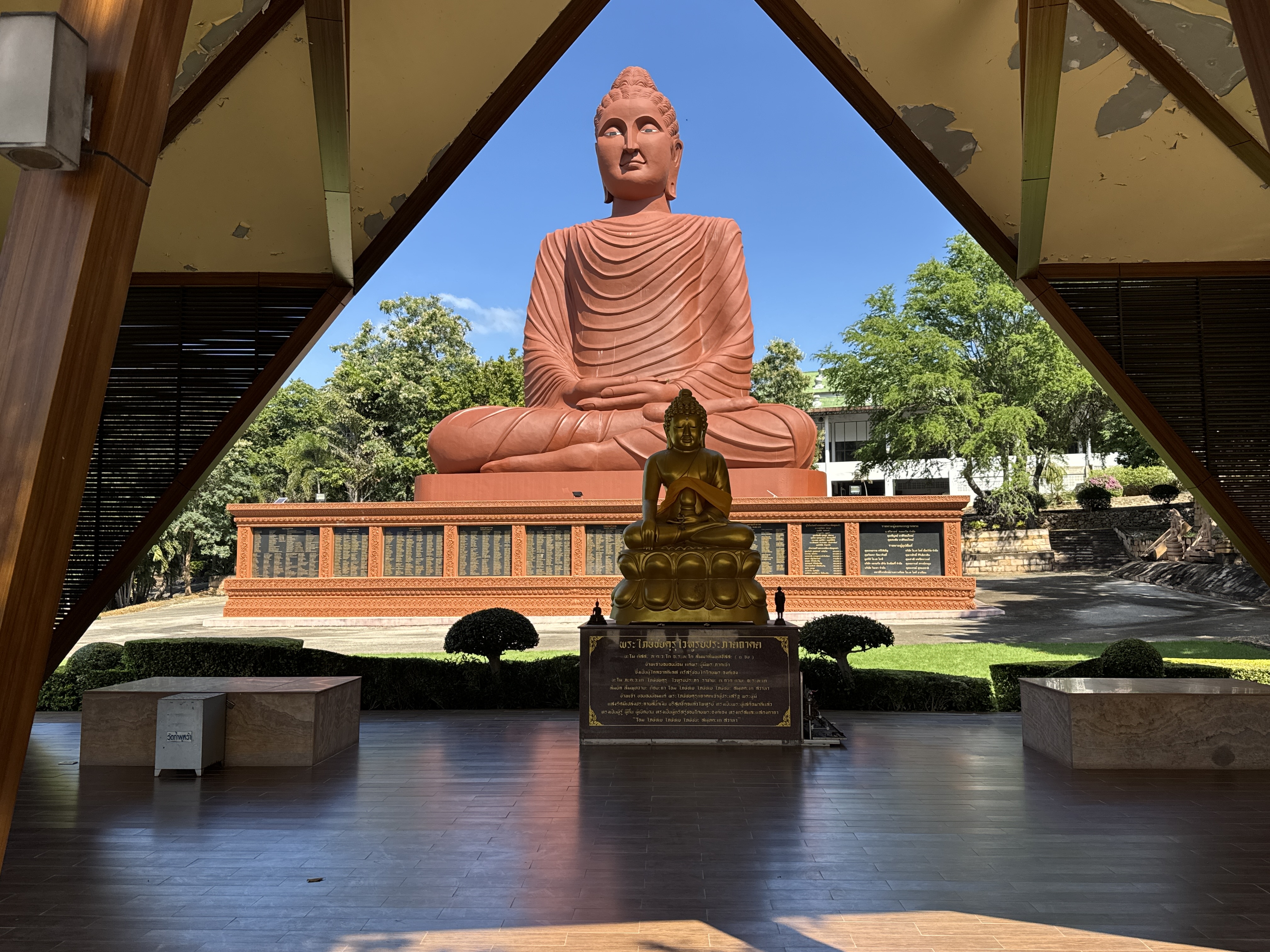 When you first come to the temple you are greeted with manicured gardens. The next thing you see is a brown reclining Buddha and a large seated Buddha made from the same stone. The ordination hall and Wihan also have the brown stone with Cambodian styling to the buildings.