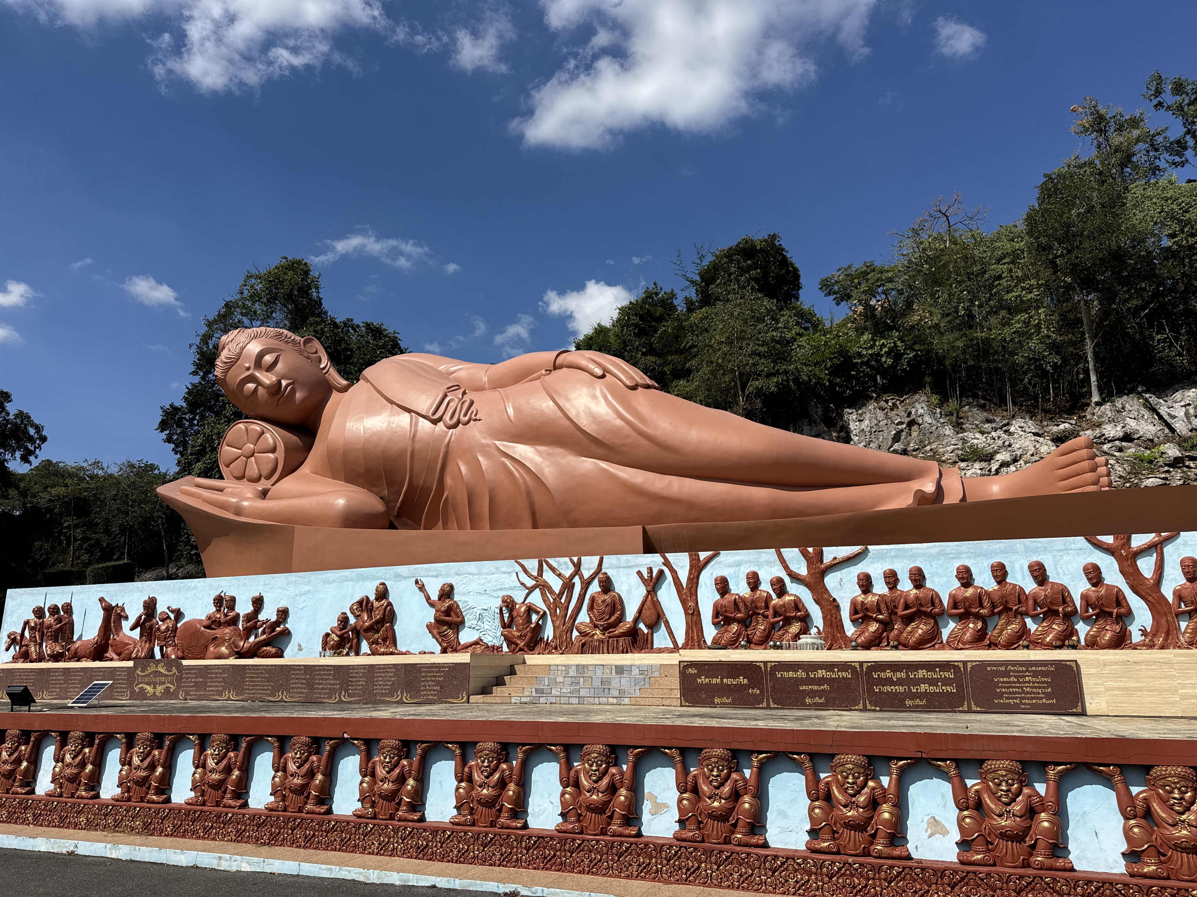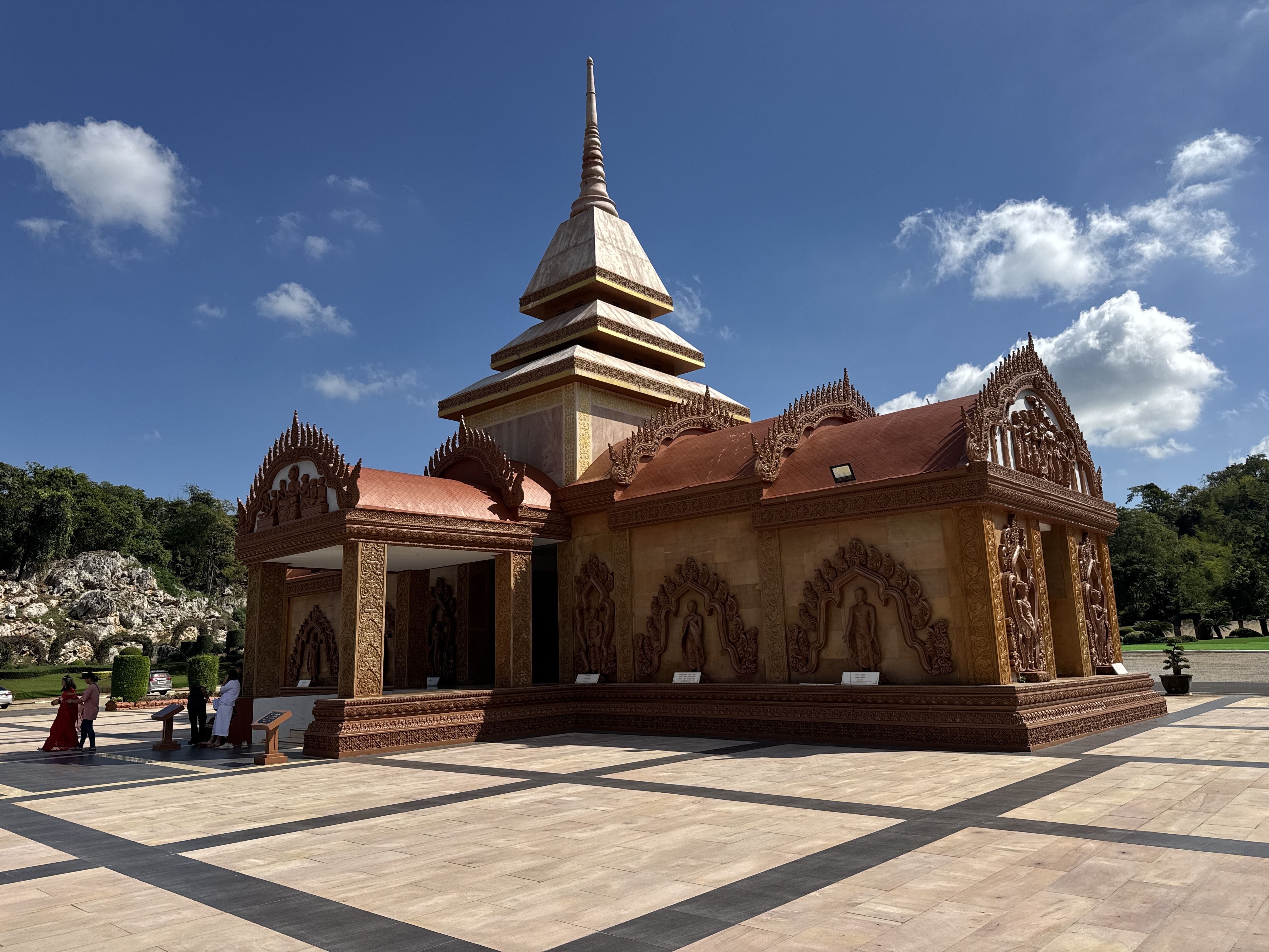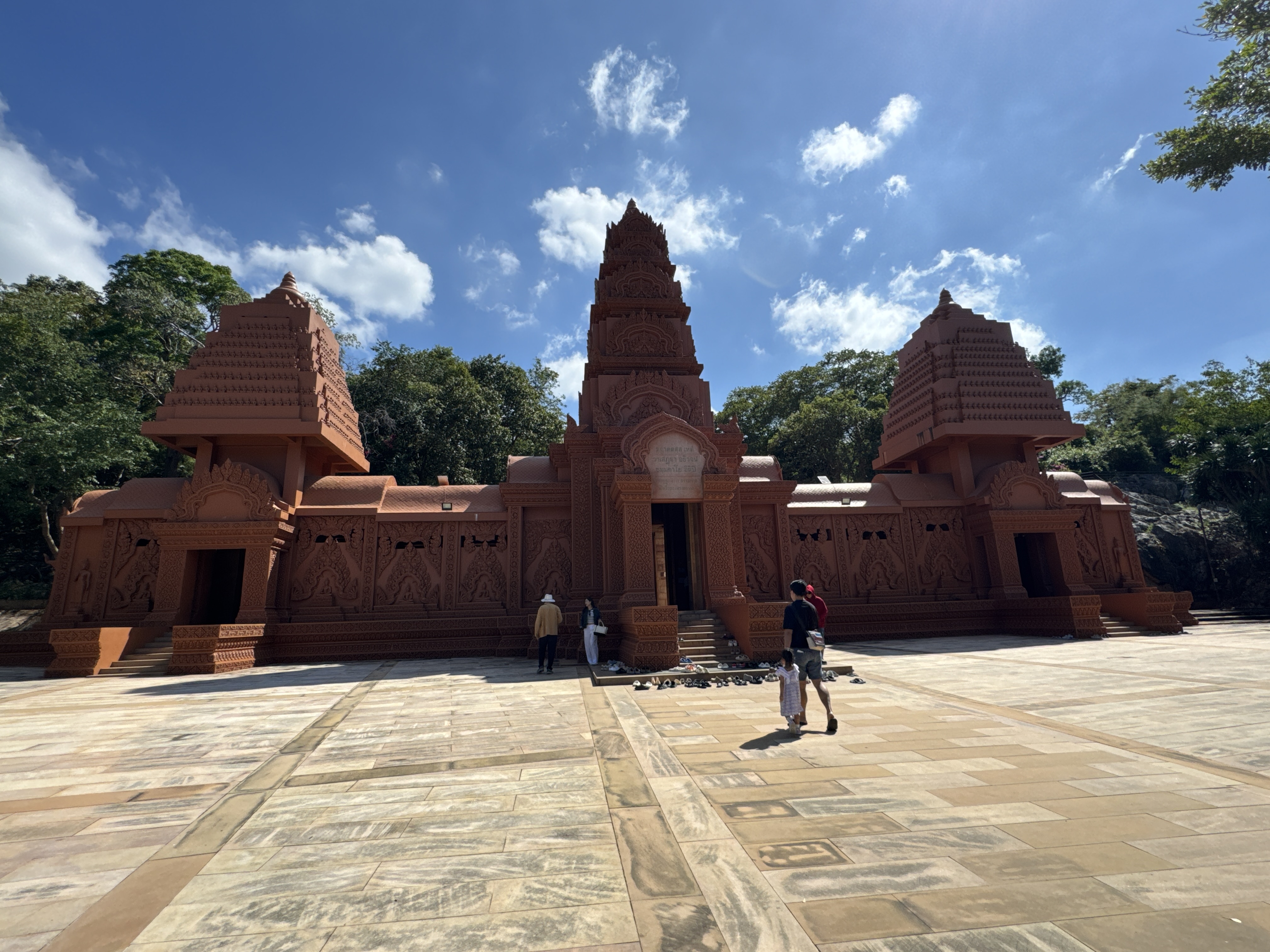 When you first come to the temple you are greeted with manicured gardens. The next thing you see is a brown reclining Buddha and a large seated Buddha made from the same stone. The ordination hall and Wihan also have the brown stone with Cambodian styling to the buildings.