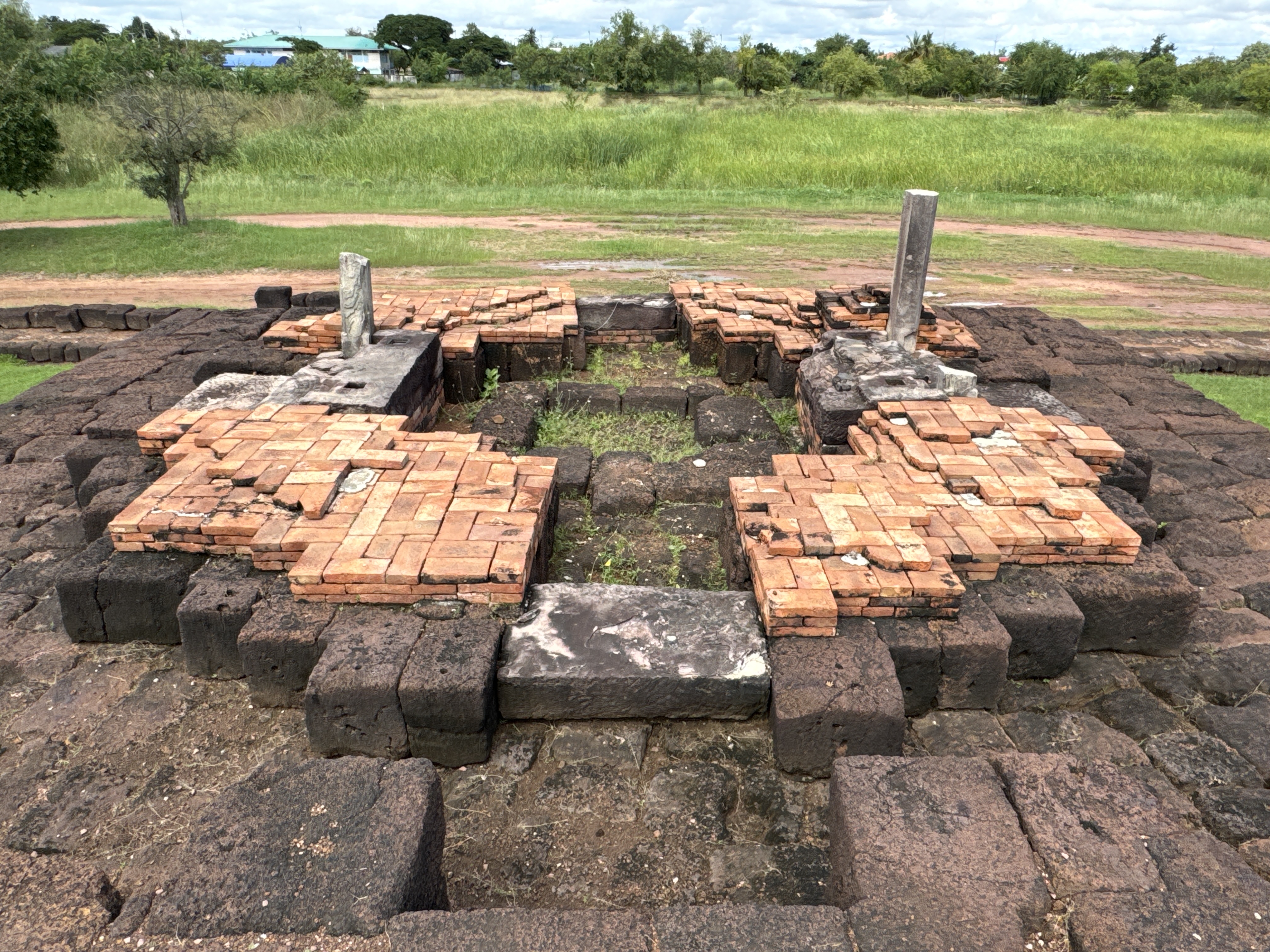 Constructed primarily of laterite with remnants of sandstone carvings, the site centers on a raised rectangular platform that once supported three brick towers aligned east-west—hallmarks of the Bayon-style architecture promoted by King Jayavarman VII (1181–1218).